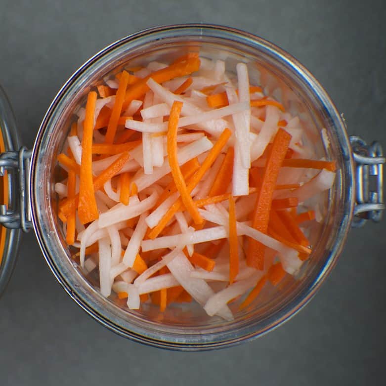 Do chua is carrot and mooli (aka daikon radish), pickled in salt, sugar and vinegar. It’s the key ingredient in what is undoubtedly one of the world’s GOAT sandwiches – the banh mi. It keeps well in the fridge and is a really good addition to salads and sandwiches which after you make a batch, you can have on hand at all times. Also, as it’s fermented it’s believed to be rich in numerous bacteria which are of benefit to your gut.